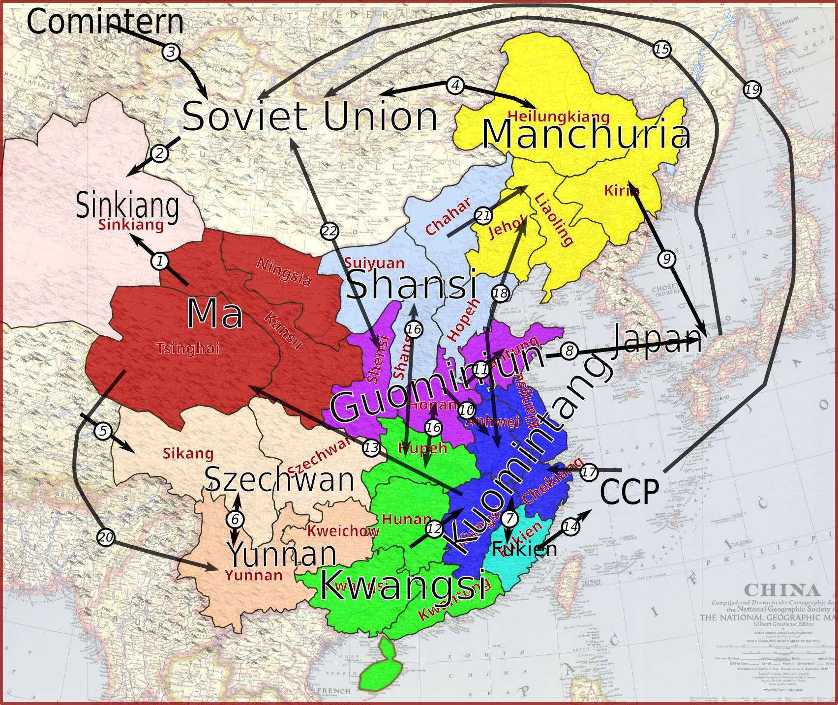 - Chinese Factions: warlords from the previous era were largely still in place and felt a need for independence. They were (some more than others) distrustful of the KMT and largely had their armies intact although removal of tax income from them would have seriously endangered this.